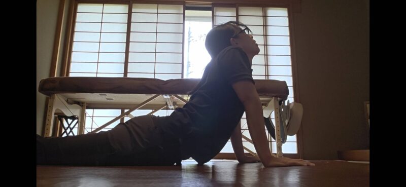 腹直筋伸ばし。呼吸で伸ばします。腰を反るんじゃなくて、お腹を反らしてます。